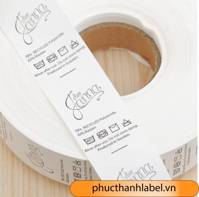 Nhãn quần áo in nylon rất phổ biến để dùng làm nhãn chăm sóc, nhãn hướng dẫn sử dụng và in biểu tượng chăm sóc, mã vạch hoặc mã QRcode.